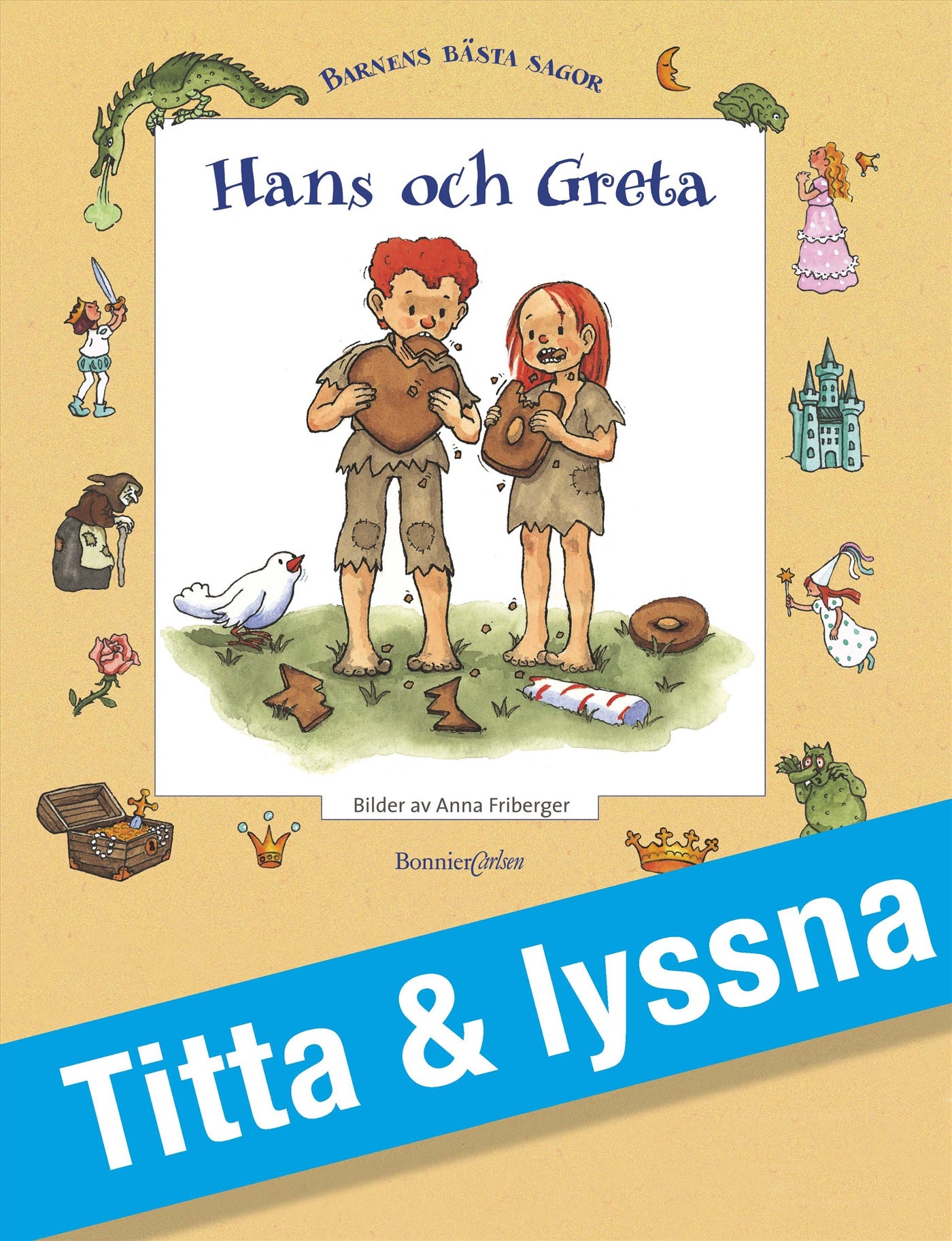 Titta och lyssna på bröderna Grimms klassiska saga Hans och Greta. Det här är en e-bok för för alla barn i förskoleåldern där barnet själv kan välja mellan att lyssna, läsa och/eller bara titta på bilderna. I den här utgåvan kommer e-boken med bild och ljud. Illustratör är Anna Friberger och uppläsare Tomas Bolme. Fribergers lätta ljusa färgskala gör det hemska lagom hemskt för barnen, och det lyckliga slutet så skirande bekymmersfritt som det alltid varit, för generationer av barn.