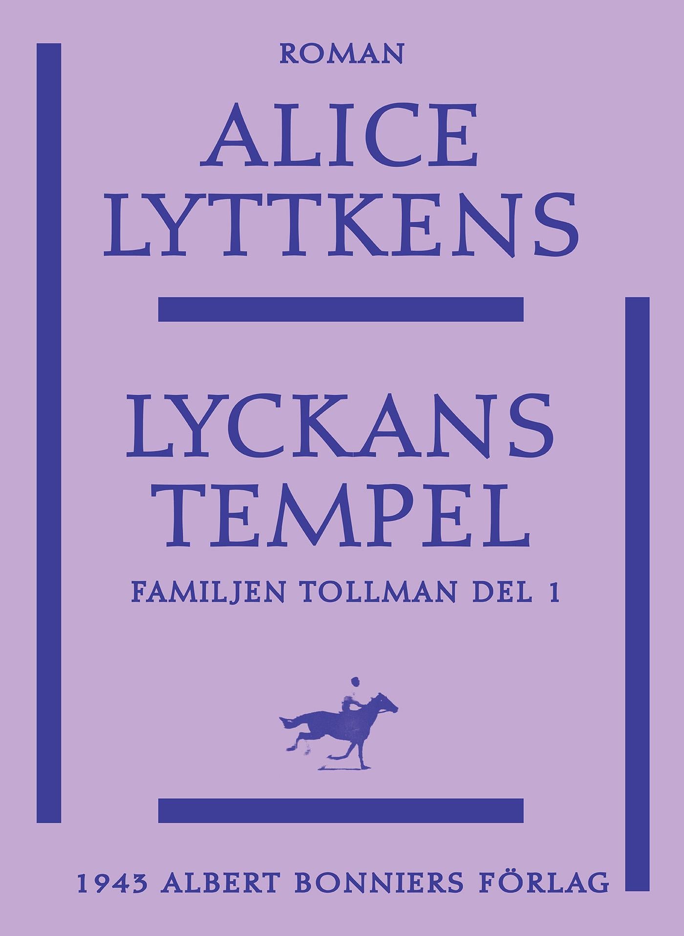 Alice Lyttkens mästerliga hand för oss rakt in i 1700-talets gnistrande Stockholm. ”Lyckans tempel” är den första delen i Tollman-sviten, som fortsätter följa familjen Tollman genom generationerna i ”Lyckans tempel”, ”Längtans blåa blomma”, ”Nya stjärnor tändas”, ”Statt upp min älskade” och ”Tag lyckan fatt”. 1998 blev sviten till tv-serien ”Längtans blåa blomma”.